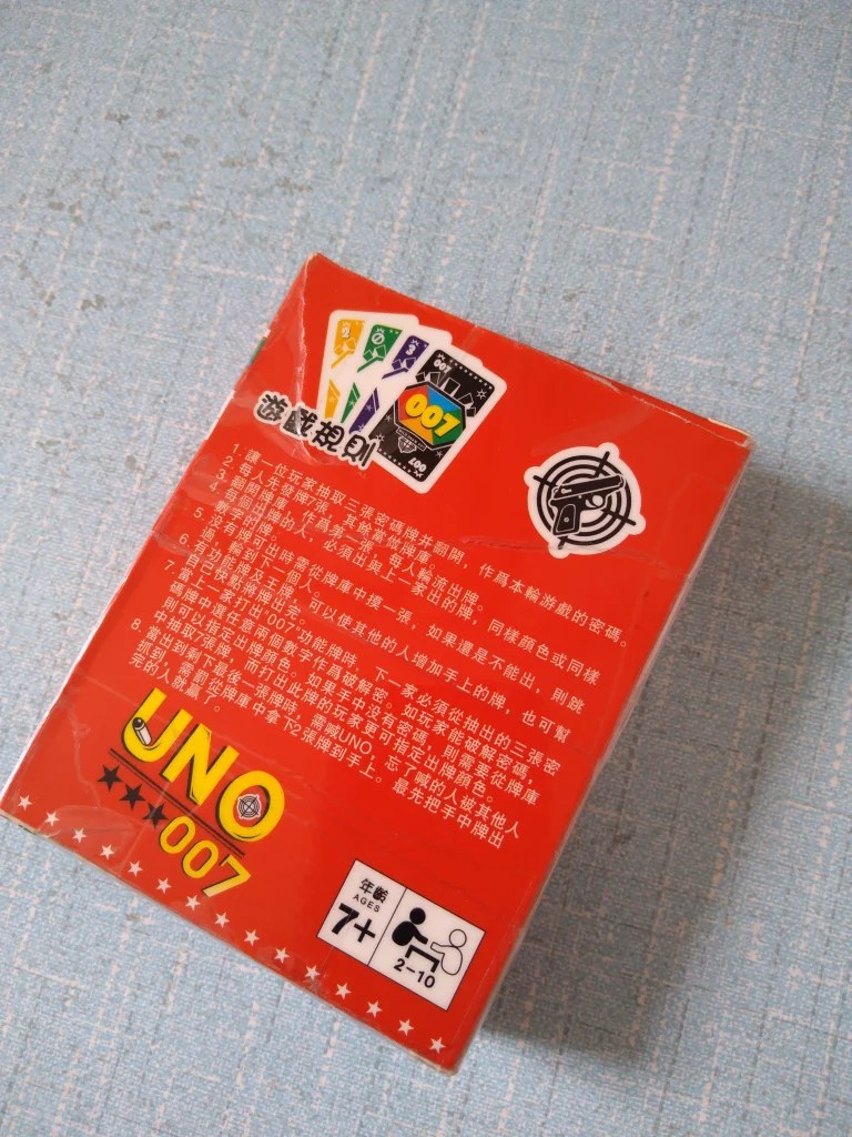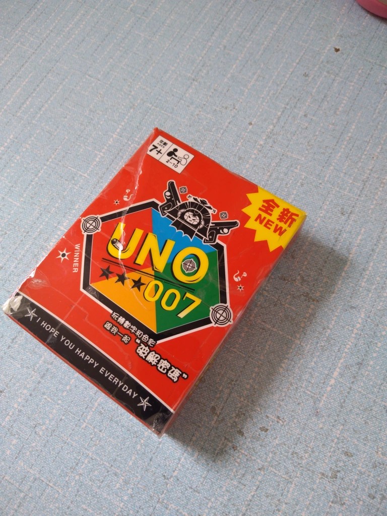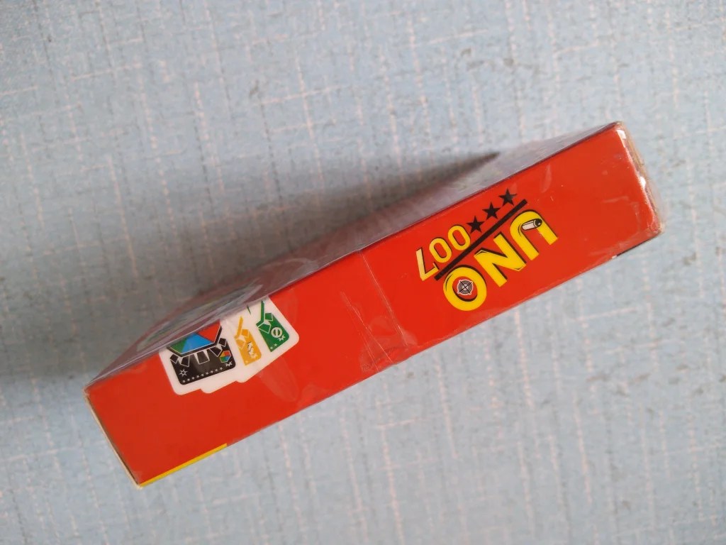 Well this Friday was my wife’s turn to choose. She likes the simpler games and chose Uno. After one game she noticed in my “UNO box” there was something called “007 UNO”, and inquired.