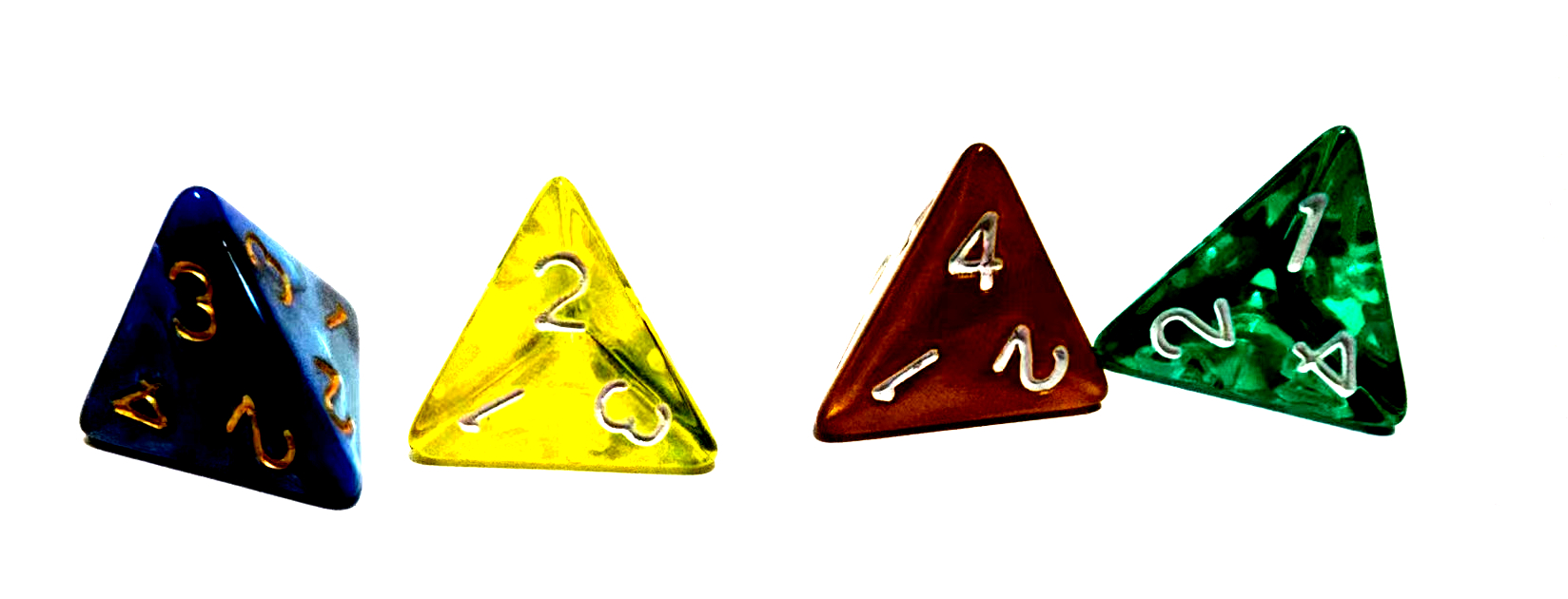 The game is played by going four for four — the full 16 is the best set of rolls you can get, and an automatic winner. This is played similarly to Texas Hold ’em poker. There are four rounds — during each round, a player will roll a d4, keeping the numbers secret until the last hand. Getting all threes is the second-highest hand. All twos is the third biggest, and all ones the fourth biggest. If no one swept their rolls, the person with the highest sum total wins the pot.