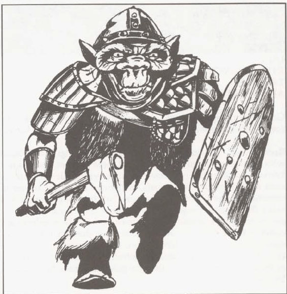 Goblins have flat faces, broad noses, pointed ears, wide mouths and small, sharp fangs. Their foreheads slope back, and their eyes are usually dull and glazed. They always walk upright, but their arms hang down almost to their knees. Their skin colors range from yellow through any shade of orange to a deep red. Usually a single tribe has members all of about the same color skin. Their eyes vary from bright red to a gleaming lemon yellow. They wear clothing of dark leather, tending toward dull soiled-looking colors.